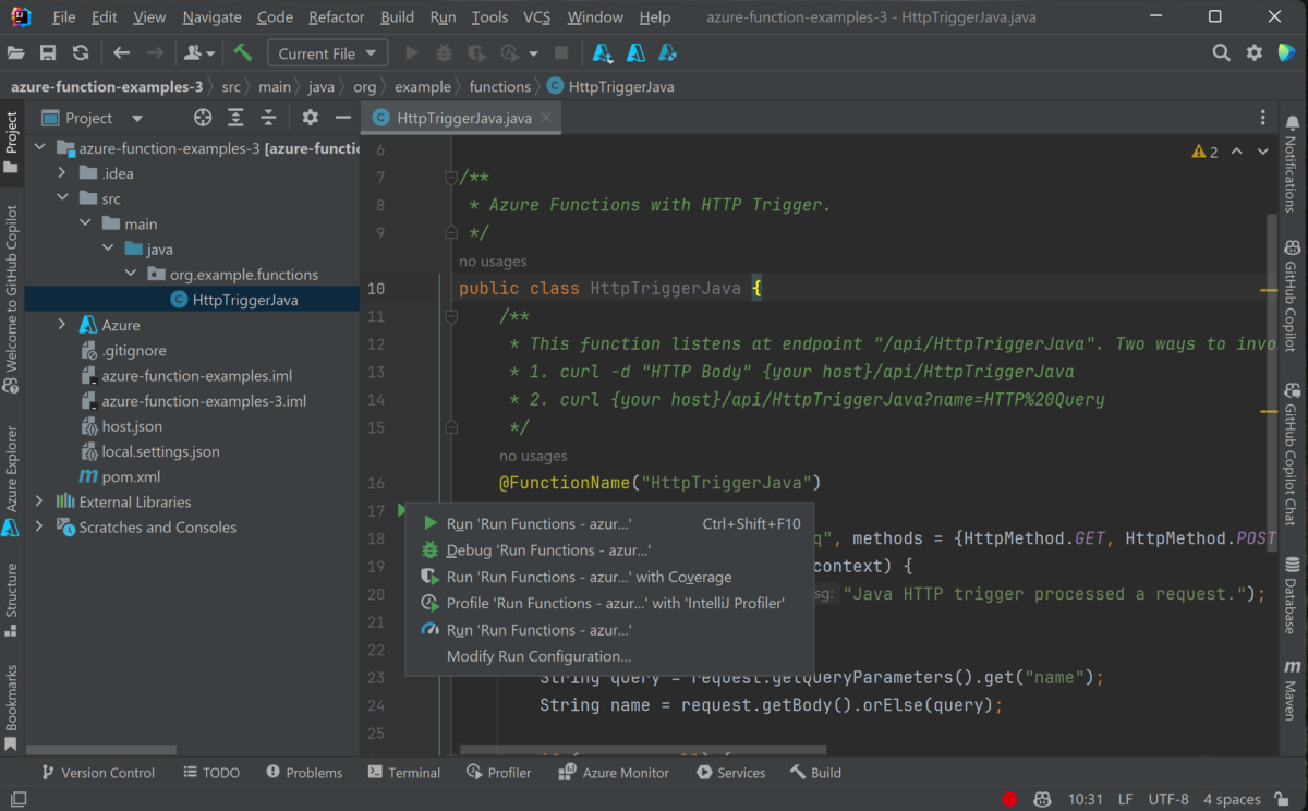 Navigate to src/main/java/org/example/functions/HttpTriggerJava.java to see the code generated. Beside line 17, you should see a green Run button. Select it and then select Run 'Functions-azur...'. You should see your function app running locally with a few logs.