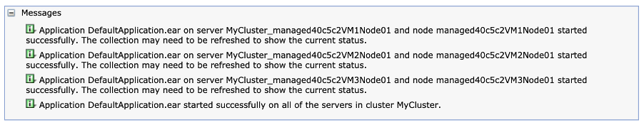 Next, you need to start the application. Go to Applications > All Applications. Select the checkbox for DefaultApplication.ear, ensure the Action is set to Start, and then select Submit Action.