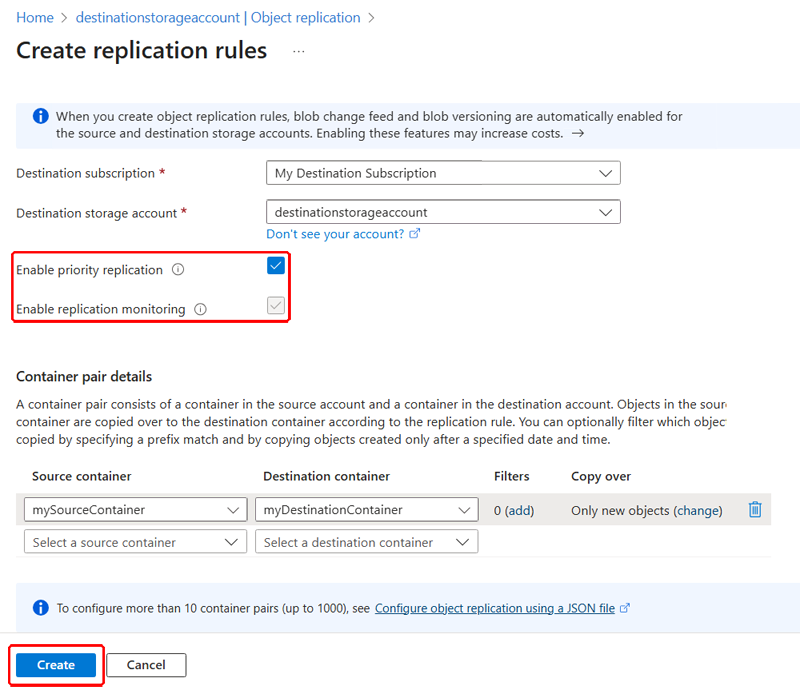 4. Create your container pair by selecting the Source container and Destination container values from the dropdown menus. Finally, select Create to add the new OR policy with priority replication enabled.