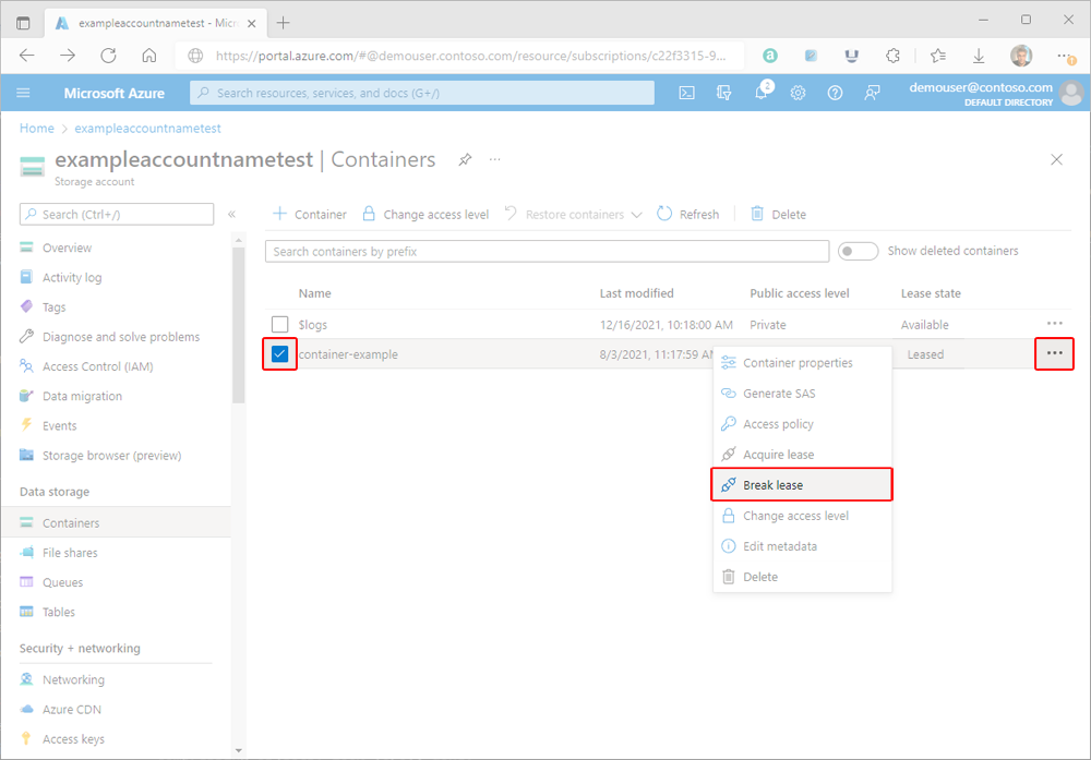 Select the container's More button (...), and select Acquire lease to request a new lease and display the details in the Lease status pane.