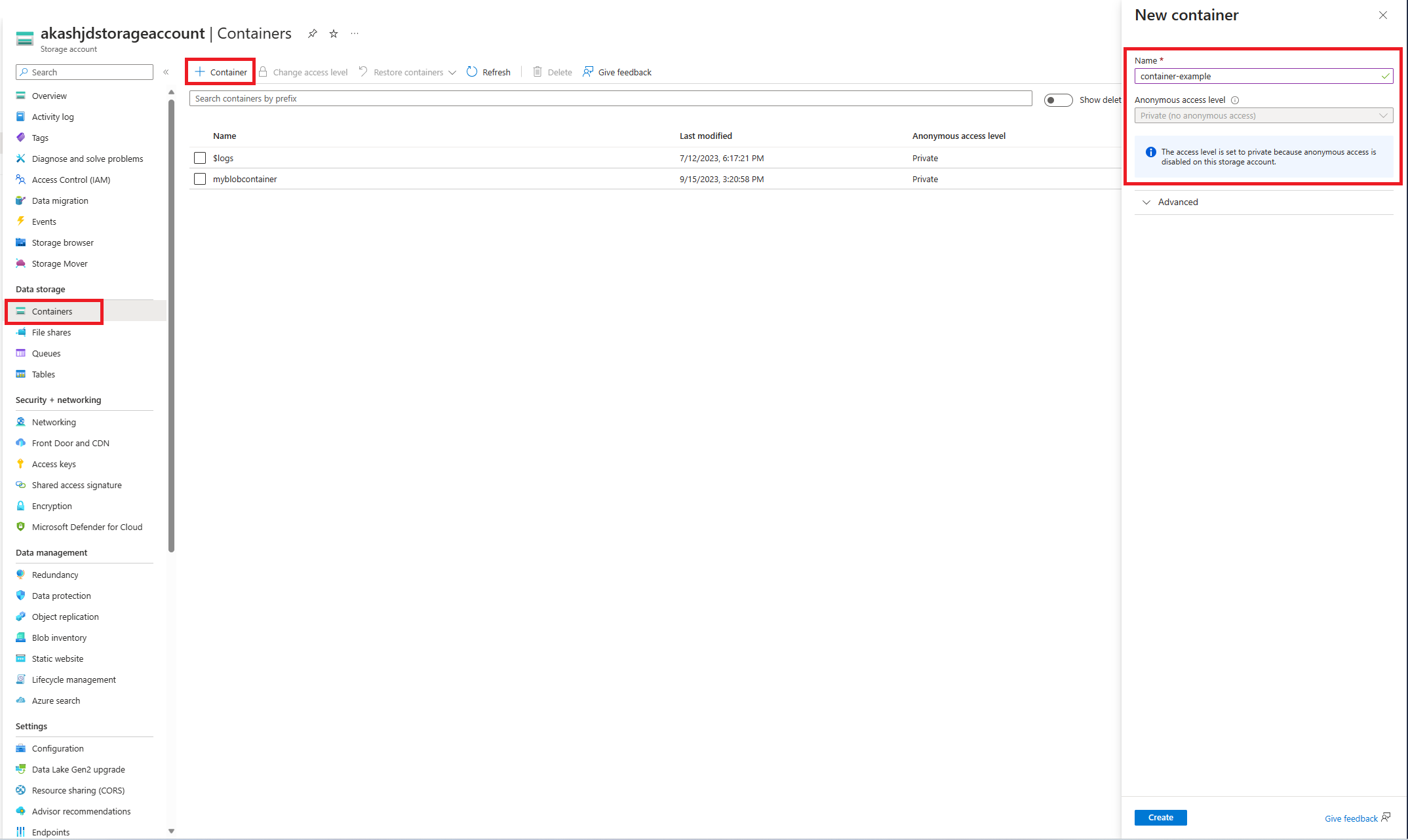 Set the Anonymous access level for the container. The recommended level is Private (no anonymous access). For information about preventing anonymous access to blob data, see Overview: Remediating anonymous read access for blob data.
