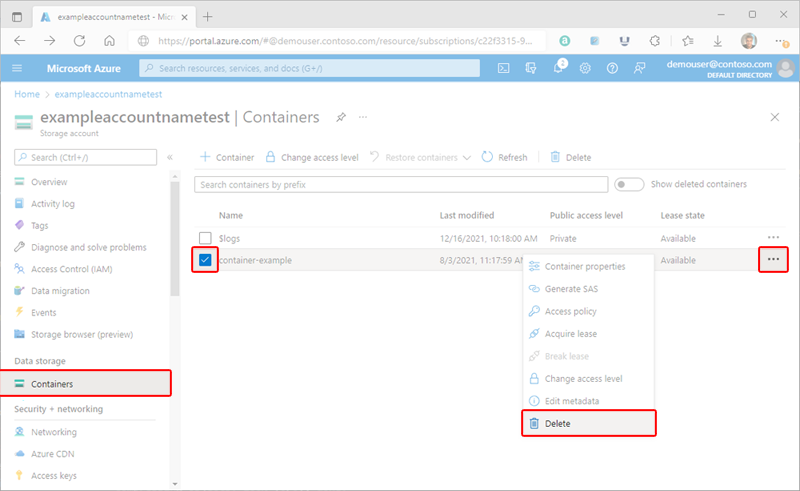 In the navigation pane for the storage account, scroll to the Data storage section and select Containers.