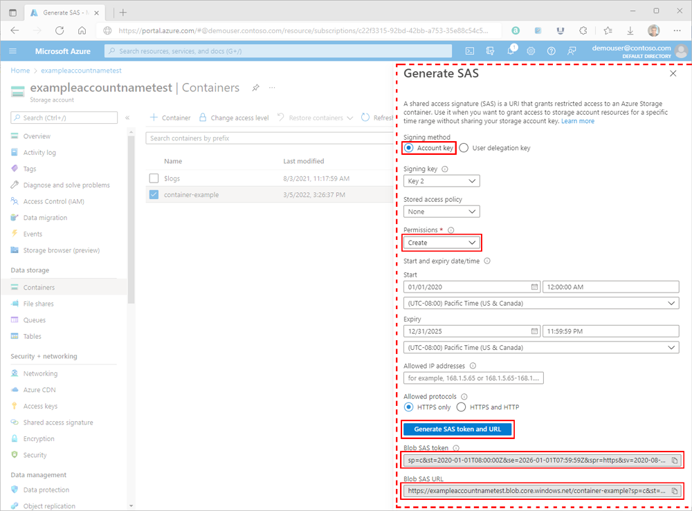 Copy and paste the blob SAS token and blob SAS url values in a secure location. They'll only be displayed once and can't be retrieved after the window is closed.