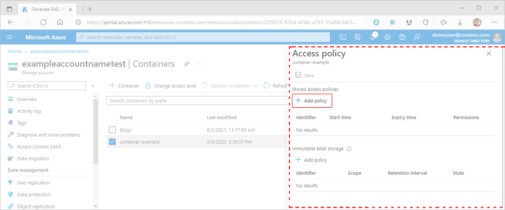 Within the Access policy pane, select + Add policy in the Stored access policies section to display the Add policy pane. Any existing policies will be displayed in either the appropriate section.