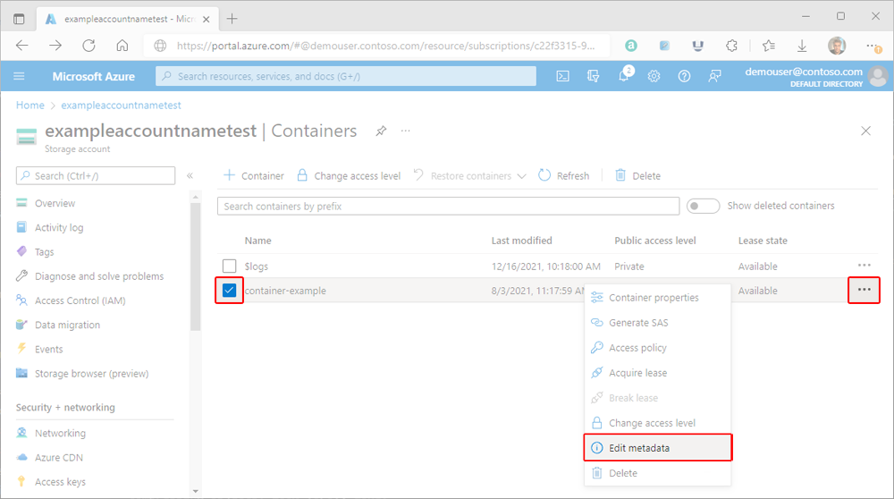 Select the container's More button (...), and then select Edit metadata to display the Container metadata pane.