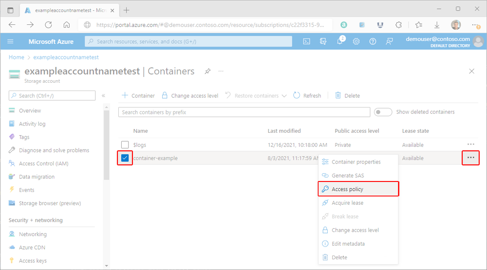 Select the container's More button (...), and select Access policy to display the Access policy pane.