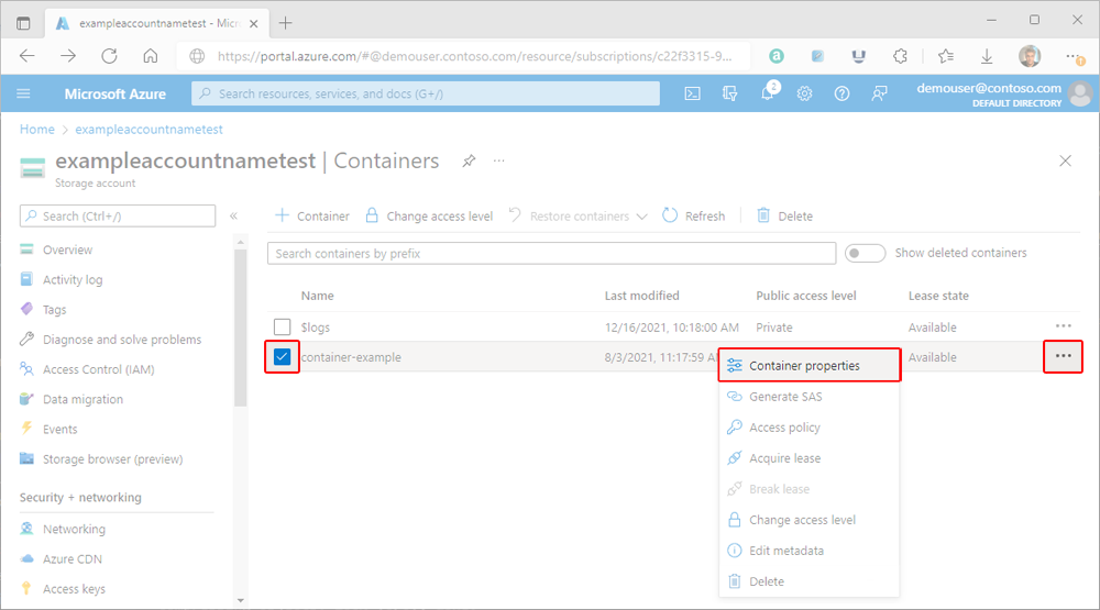 Select the container's More button (...), and select Container properties to display the container's Properties pane.