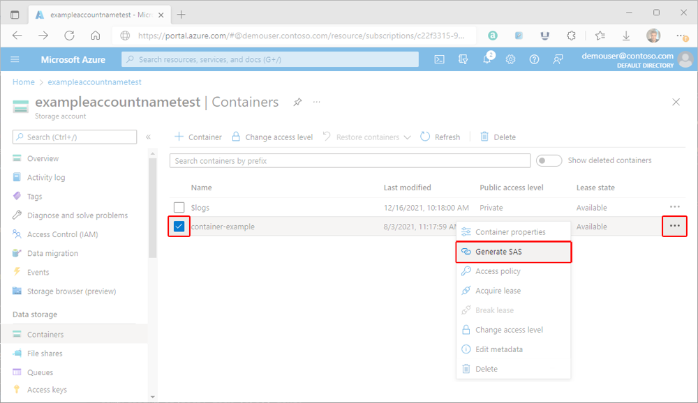 Select the container's More button (...), and select Generate SAS to display the Generate SAS pane.
