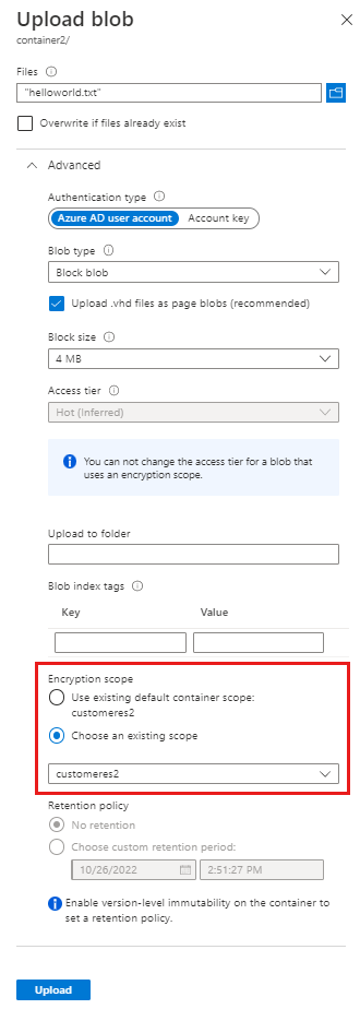 To upload a blob with an encryption scope via the Azure portal, first create the encryption scope as described in Create an encryption scope. Next, follow these steps to create the blob: