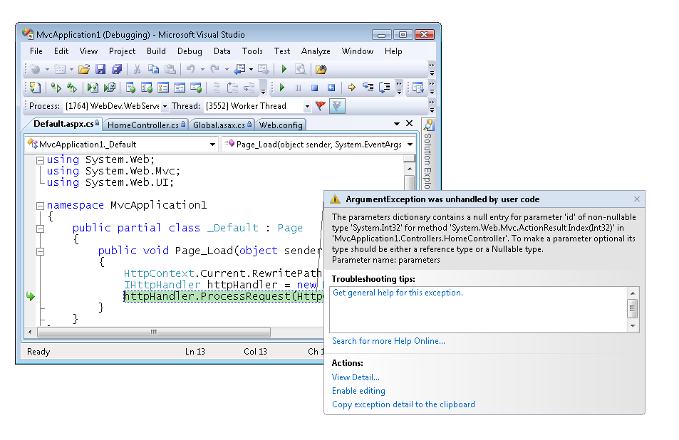 Finally, invoking the Index() method in Listing 5 with the URL /Home causes an exception since the Id parameter is not a nullable parameter. If you attempt to invoke the Index() method then you get the error displayed in Figure 1.