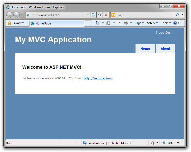 This will cause Visual Web Developer to start a development web-server and run our web application (there are no configuration or manual steps required to enable this). It will then launch a browser and configure it to browse the application's home-page. Notice below that the address bar of the browser says "localhost", and not something like example.com. That's because localhost always points to your own local computer - which in this case is running the application we just built.