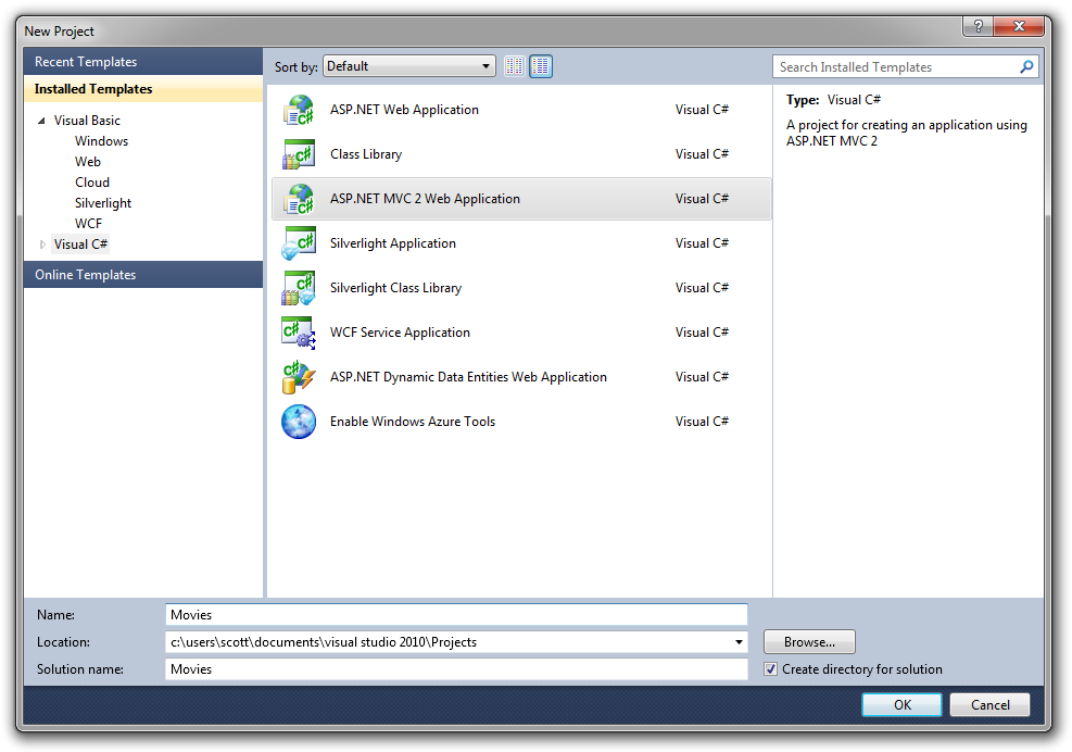 You can create applications using Visual Basic or Visual C#. For now, Select Visual C# on the left, then pick "ASP.NET MVC 2 Web Application." Name your project "Movies" and click OK.