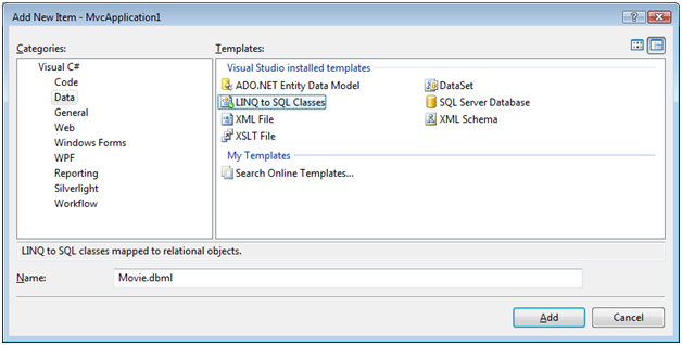 Our MVC model will contain LINQ to SQL classes that represent the tblMovie database table. The easiest way to create these LINQ to SQL classes is to right-click the Models folder, select Add, New Item, select the LINQ to SQL Classes template, give the classes the name Movie.dbml, and click the Add button (see Figure 4).