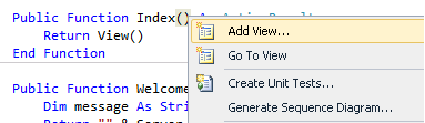 Now we need a WelcomeView template! Run the application so the new code is compiled. Close the browser, right-click inside the Welcome method, and then click Add View.