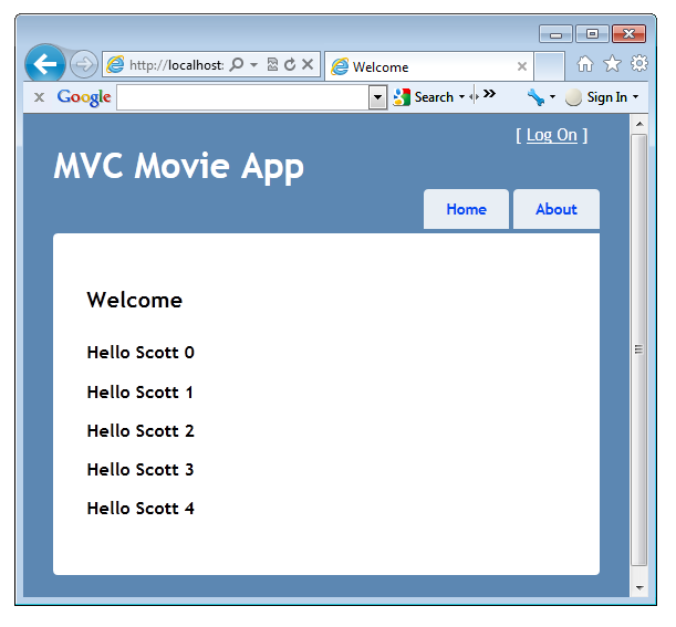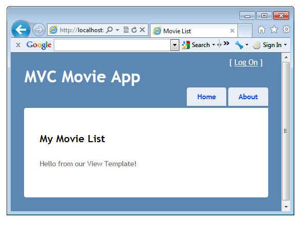 Run the application and note it now says "MVC Movie App". Click the About link, and that page shows "MVC Movie App", too.