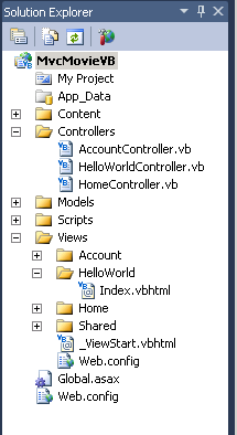 The MvcMovie\Views\HelloWorld folder and the MvcMovie\Views\HelloWorld\Index.vbhtml file are created. You can see them in Solution Explorer: