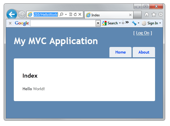 Run the application and browse tohttp://localhost:xx/HelloWorld. Notice that the browser title, the primary heading, and the secondary headings have changed. It's easy to make big changes in your application with small changes to a view. (If you don't see changes in the browser, you might be viewing cached content. Press Ctrl+F5 in your browser to force the response from the server to be loaded.)
