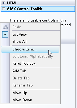 - Right-click beneath the AJAX Control Toolkit tab and select the menu option Choose Items (see Figure 5).