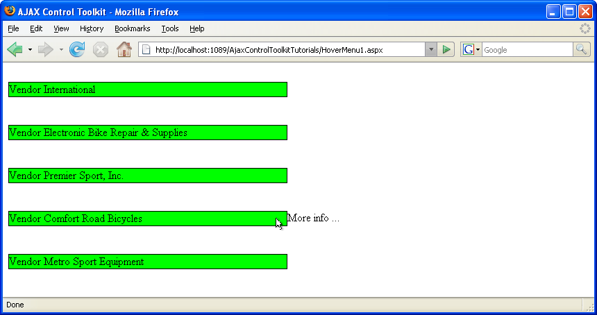 Now, the HoverMenuExtender comes into play. So that every element in the data source gets its own popup, the extender must be put within the repeater's <ItemTemplate> section. Here is the markup:
