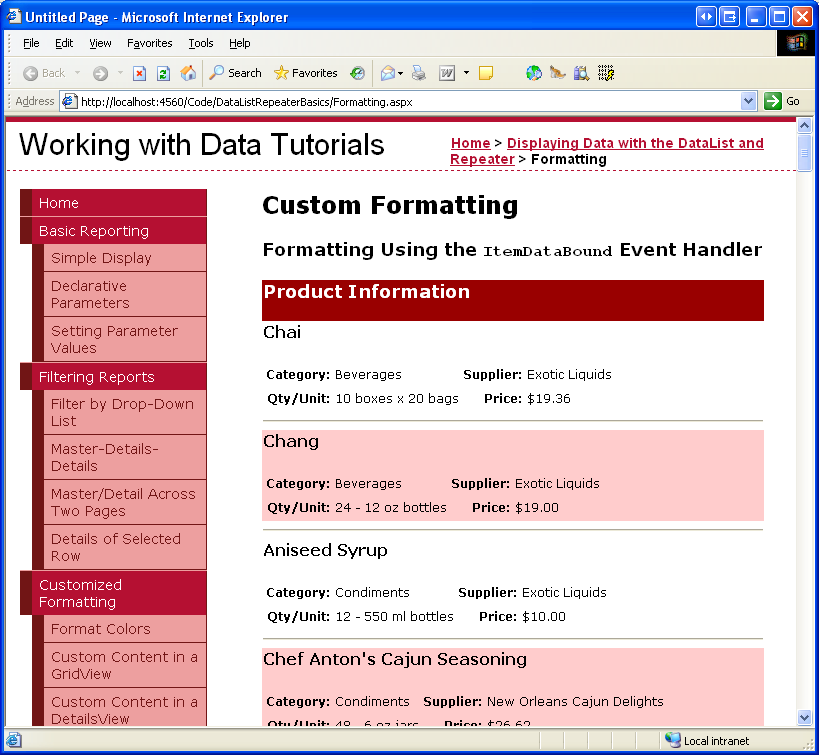 Once you have replicated the DataList and ObjectDataSource functionality from Basics.aspx into Formatting.aspx, take a moment to change the DataList s ID property from DataList1 to a more descriptive ItemDataBoundFormattingExample. Next, view the DataList in a browser. As Figure 1 shows, the only formatting difference between each product is that the background color alternates.
