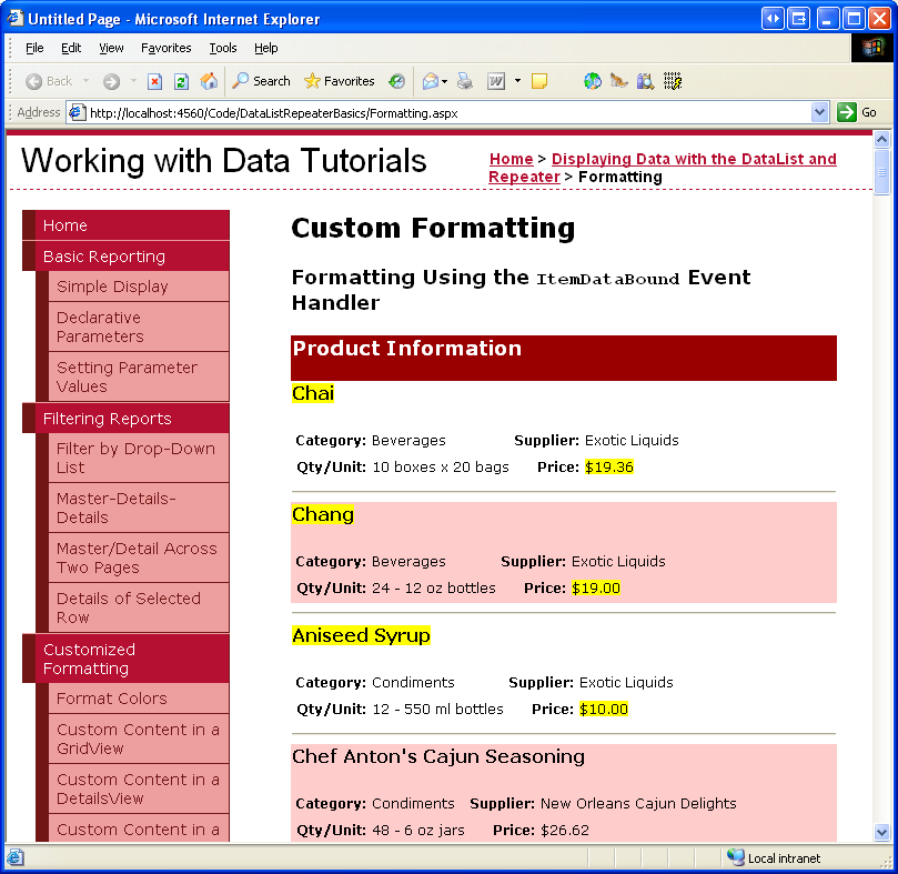 With the ItemDataBound event handler completed, revisit the Formatting.aspx page in a browser. As Figure 2 illustrates, those products with a price under $20.00 have both their name and price highlighted.