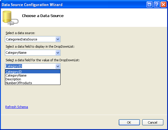 <asp:DropDownList ID="Categories" DataSourceID="CategoriesDataSource"