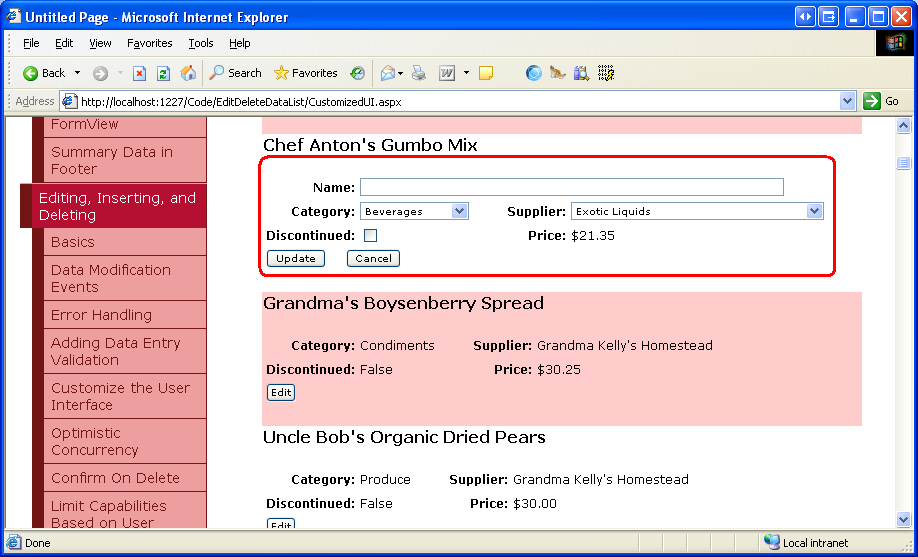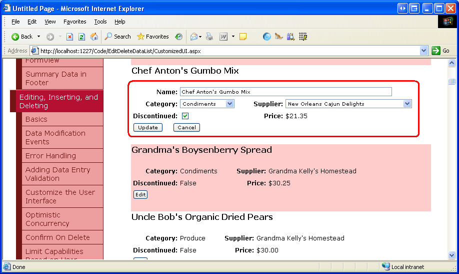 With these two event handlers in place, clicking the Edit button displays the editing interface and clicking the Cancel button returns the edited item to its read-only mode. Figure 8 shows the DataList after the Edit button has been clicked for Chef Anton s Gumbo Mix. Since we ve yet to add any databinding syntax to the editing interface, the ProductName TextBox is blank, the Discontinued CheckBox unchecked, and the first items selected from the Categories and Suppliers DropDownLists.