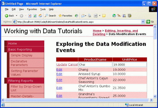 In this tutorial we'll examine using these events to extend the built-in inserting, updating, and deleting capabilities of the ASP.NET data Web controls. We'll also see how to customize the editing interface to only update a subset of the product fields.