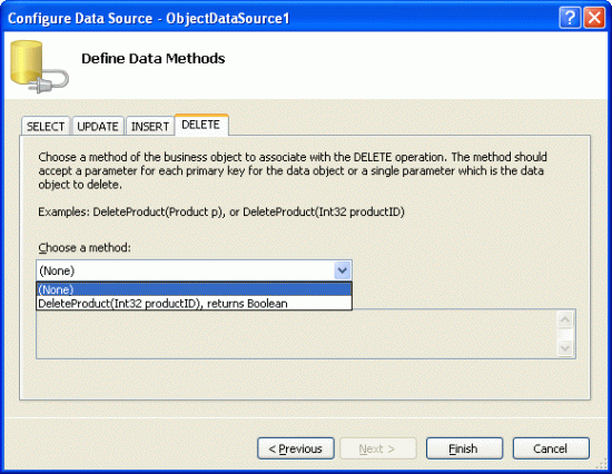 To configure the ObjectDataSource, select the Configure Data Source link from its smart tag, launching the wizard. The first screen allows you to change the underlying object the ObjectDataSource is bound to; leave it set to ProductsBLL. The next screen lists the mappings from the ObjectDataSource's methods to the underlying object's. Even though we explicitly indicated that the Insert() and Delete() methods should not be mapped to any methods, if you go to the INSERT and DELETE tabs you'll see that a mapping is there. This is because the ProductsBLL's AddProduct and DeleteProduct methods use the DataObjectMethodAttribute attribute to indicate that they are the default methods for Insert() and Delete(), respectively. Hence, the ObjectDataSource wizard selects these each time you run the wizard unless there's some other value explicitly specified.