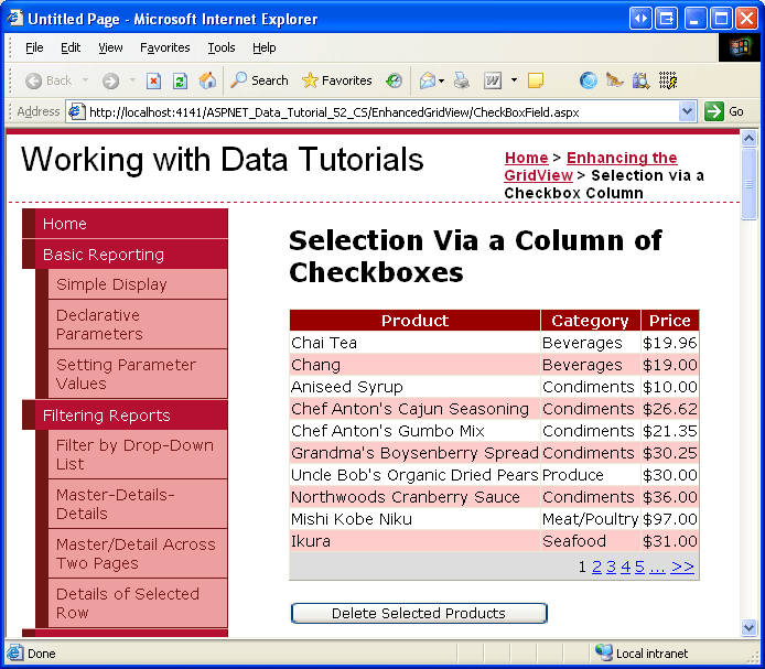 In this tutorial we will see how to add a column of checkboxes and how to determine what checkboxes were checked on postback. In particular, we'll build an example that closely mimics the web-based email client user interface. Our example will include a paged GridView listing the products in the Products database table with a checkbox in each row (see Figure 1). A Delete Selected Products button, when clicked, will delete those products selected.