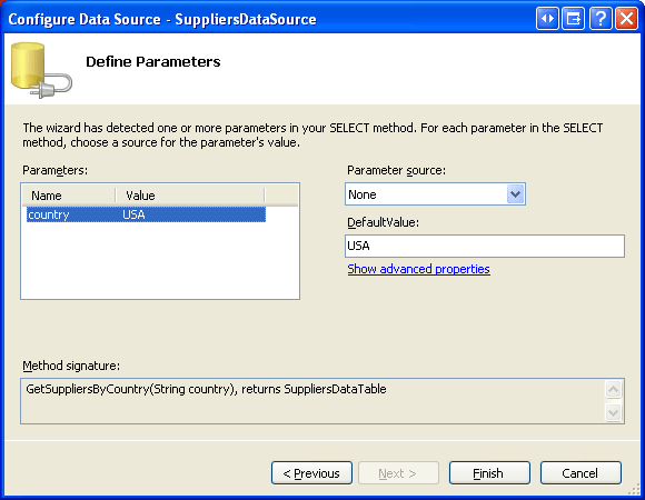 Since the GetSuppliersByCountry(country) method accepts a parameter, the Configure Data Source wizard prompts us for the source of that parameter. To specify a hard coded value ( USA, in this example), leave the Parameter source drop-down list set to None and enter the default value in the textbox. Click Finish to complete the wizard.