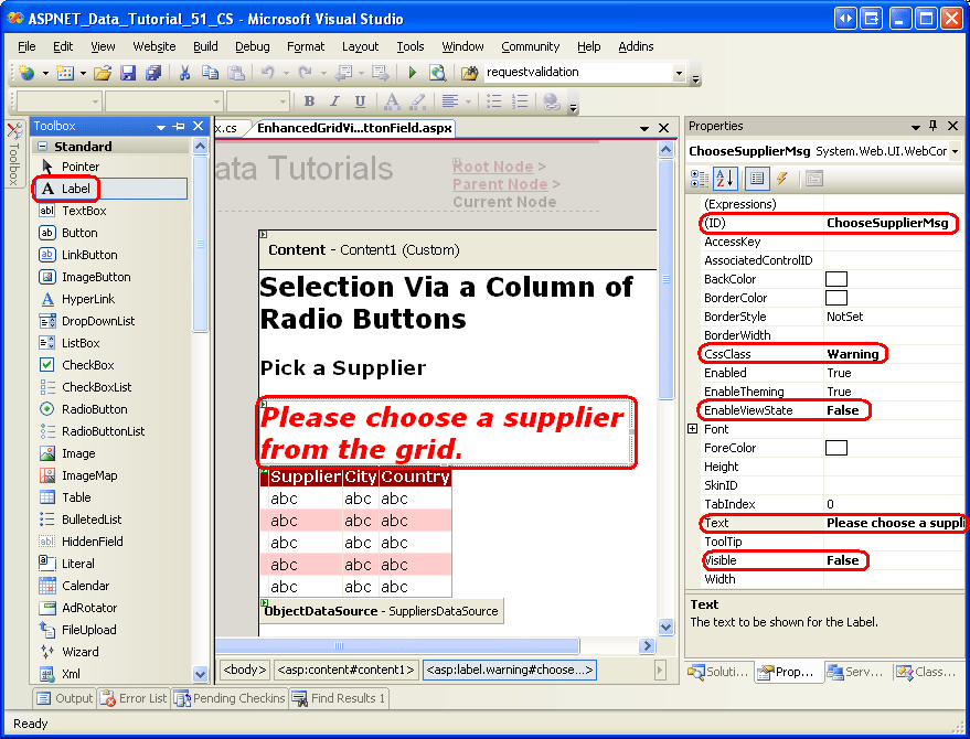 To accommodate a SuppliersSelectedIndex value of -1, add a Label Web control to the page above the GridView. Set its ID property to ChooseSupplierMsg, its CssClass property to Warning, its EnableViewState and Visible properties to false, and its Text property to Please choose a supplier from the grid. The CSS class Warning displays text in a red, italic, bold, large font and is defined in Styles.css. By setting the EnableViewState and Visible properties to false, the Label is not rendered except for only those postbacks where the control s Visible property is programmatically set to true.