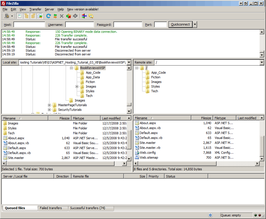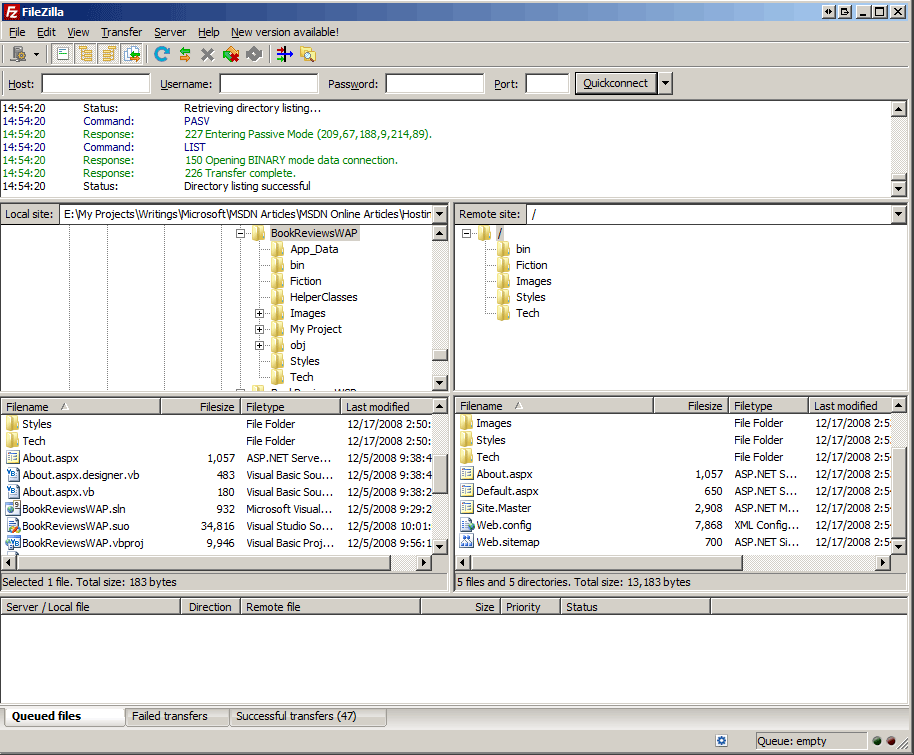 Figure 1 shows FileZilla after the necessary files have been copied. FileZilla displays the files on the local computer on the left and the files on the remote computer on the right. As Figure 1 shows, the ASP.NET source code files, such as About.aspx.vb, are on the local computer (the development environment) but were not copied to the web host provider (the production environment) because code files do not need to be deployed when using explicit compilation.