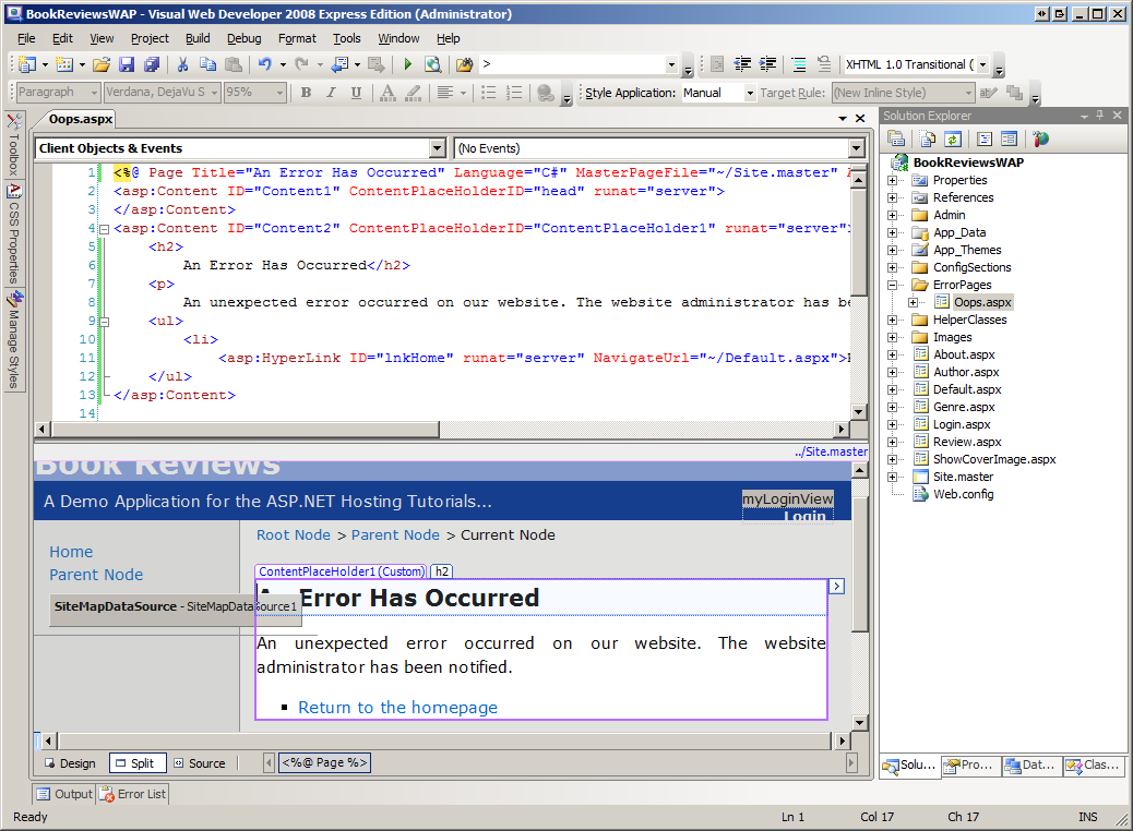 Every web application should have a custom error page. It provides a more professional-looking alternative to the Runtime Error YSOD, it is easy to create, and configuring the application to use the custom error page takes only a few moments. The first step is creating the custom error page. I've added a new folder to the Book Reviews application named ErrorPages and added to that a new ASP.NET page named Oops.aspx. Have the page use the same master page as the rest of the pages on your site so that it automatically inherits the same look and feel.