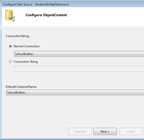 In the Configure ObjectContext wizard step, select SchoolEntities as the value for Named Connection, and select SchoolEntities as the DefaultContainerName value. Then click Next.