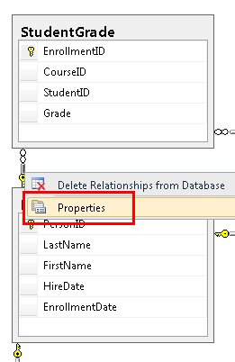 In Server Explorer, open the database diagram that you created in part 1. Right-click the relationship between Person and StudentGrade (the line between tables), and then select Properties.