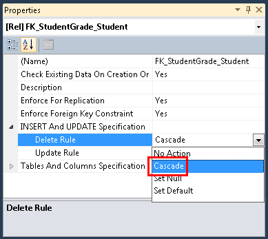 In the Properties window, expand INSERT and UPDATE Specification and set the DeleteRule property to Cascade.