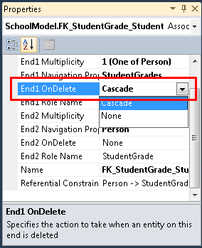 To make sure that the model keeps entities that are in memory in sync with what the database is doing, you must set corresponding rules in the data model. Open SchoolModel.edmx, right-click the association line between Person and StudentGrade, and then select Properties.