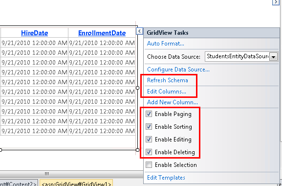 Open or switch to Students.aspx and switch to Design view. From the Data tab of the Toolbox, drag a GridView control to the right of the EntityDataSource control, name it StudentsGridView, click the smart tag, and then select StudentsEntityDataSource as the data source.