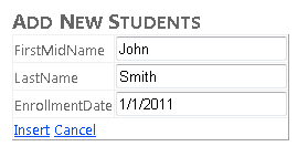 This markup creates an EntityDataSource control that is similar to the one you created in Students.aspx, except it enables insertion. As with the GridView control, the bound fields of the DetailsView control are coded exactly as they would be for a data control that connects directly to a database, except that they reference entity properties. In this case, the DetailsView control is used only for inserting rows, so you have set the default mode to Insert.