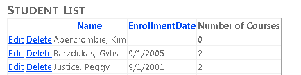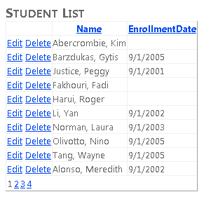 The Delete button also works. Click delete for a row that has an enrollment date and the row disappears. (Rows without an enrollment date represent instructors and you may get a referential integrity error. In the next tutorial you'll filter this list to include just students.)