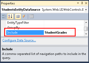 Open or switch to Students.aspx, switch to Design view, select StudentsEntityDataSource, and in the Properties window set the Include property to StudentGrades. (If you wanted to get multiple navigation properties, you could specify their names separated by commas — for example, StudentGrades, Courses.)