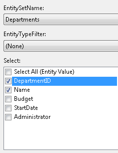 In Design view, add an EntityDataSource control to the page as you did before, except this time name it DepartmentsEntityDataSource. Select Departments as the EntitySetName value, and select only the DepartmentID and Name properties.