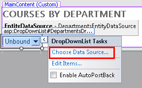 In the following steps you'll databind a DropDownList control to an entity set using an EntityDataSource control. In this part of the tutorial, you won't do much with this list. In subsequent parts, though, you'll use the list to let users select a department to display courses associated with the department.