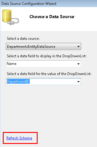 In the Choose a Data Source step, select DepartmentsEntityDataSource as the data source, click Refresh Schema, and then select Name as the data field to display and DepartmentID as the value data field. Click OK.