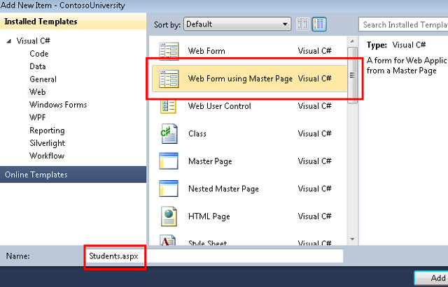 Create a new web page using the Web Form using Master Page template, and name it Students.aspx.