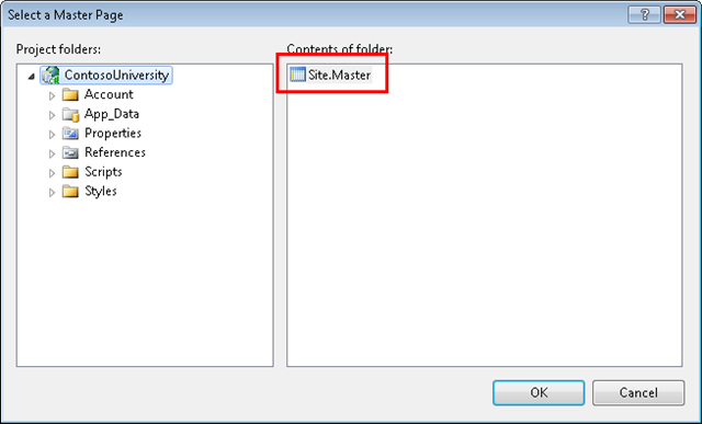 Specify Site.Master as the master page. All of the pages you create for these tutorials will use this master page.