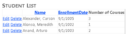 Open the Students.aspx page that you created in the previous tutorial. As currently configured, the GridView control in the page displays all the names from the People entity set. However, you want to show only students, which you can find by selecting Person entities that have non-null enrollment dates.