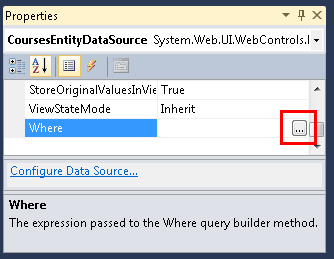 In the Properties window, click the ellipsis in the Where property box. (Make sure the CoursesEntityDataSource control is still selected before using the Properties window.)