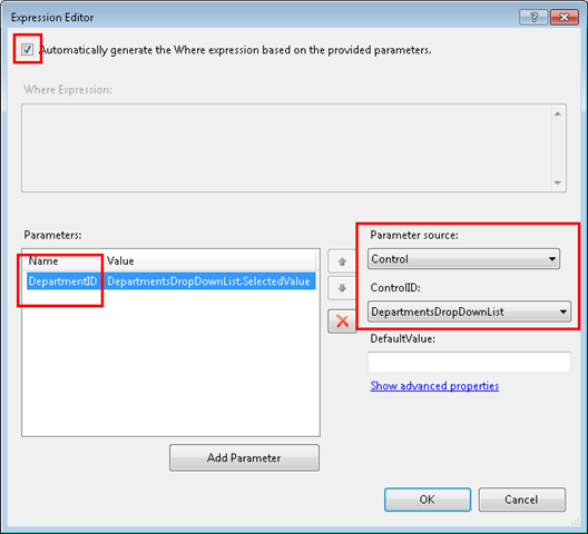 The Expression Editor dialog box is displayed. In this dialog box, select Automatically generate the Where expression based on the provided parameters, and then click Add Parameter. Name the parameter DepartmentID, select Control as the Parameter source value, and select DepartmentsDropDownList as the ControlID value.